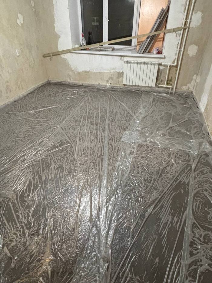 Уже на следующий день по полу можно было спокойно ходить. Я пролил поверхность водой (примерно 1–1,5 литра на квадратный метр) и накрыл плёнкой, чтобы влага не испарялась слишком быстро.