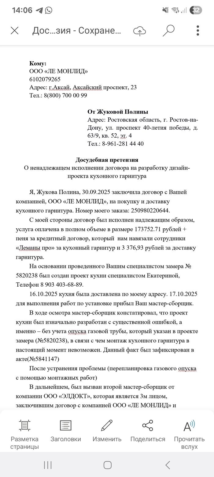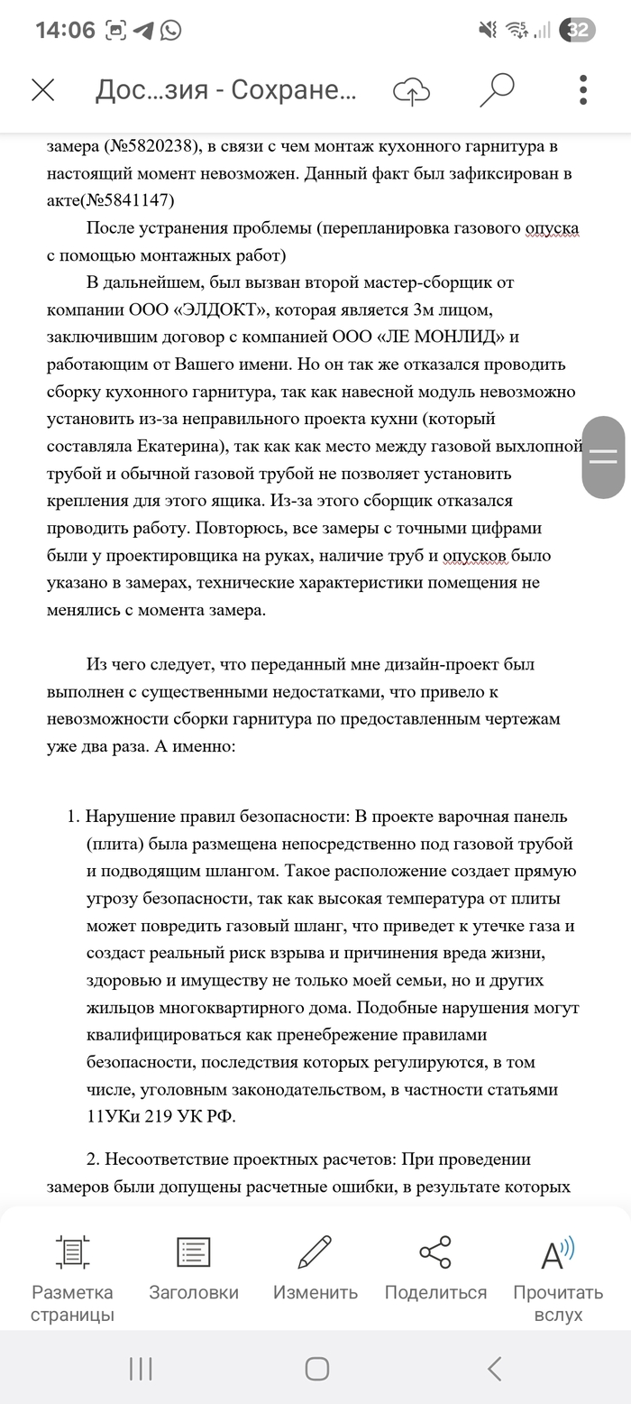 В общем, на заявление написанное 17го октября ответили 11 ноября. Где выяснилось, что кухня модульная(за почти 240 тысяч с установкой),замерщик не указал опуски( что полная брехня, они в замере указаны!), а сборщики- вообще третье лицо, и виноваты они, так как не собрали кухню, с них и спрашивайте, а наш проектировщик зайка, не причём, это у вас труба неправильно установлена)) спасибо, передам рабочим 1960х годов,что они поставили трубу не правильно и неудобно для Леманы из 2025о.