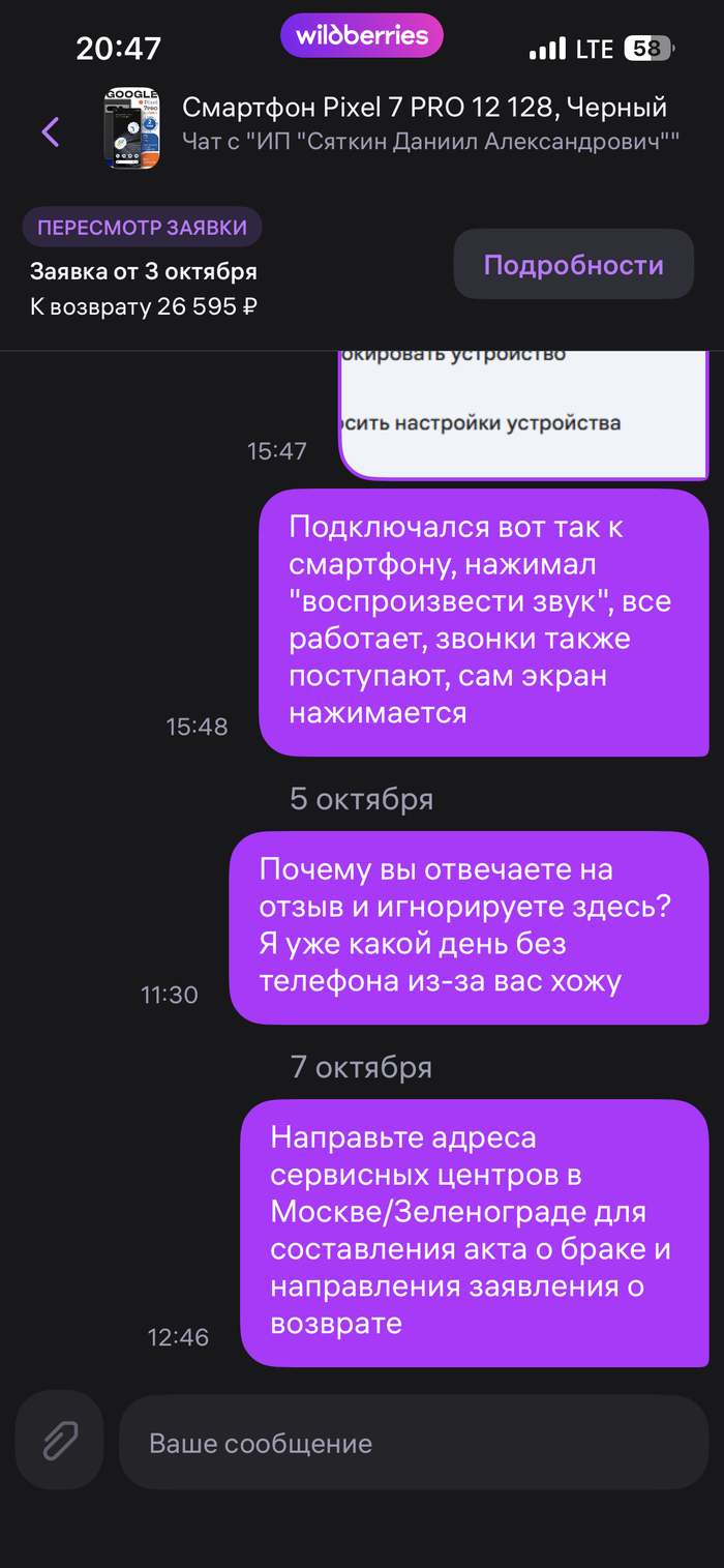 03.09.2025 я забрал телефон с ПВЗ который ждал сначала почти 2 недели, все сроки были нарушены, но в итоге происходил полнейший игнор со стороны поддержки. Спустя месяц использования телефон просто потух в руке и он работает, но сдох экран. Обмен мне никто не собирается делать, возврат продавец отказал, при этом на отзыв негативный копипаста от него прилетела, а в лс ответа нет.