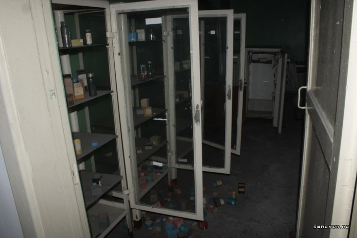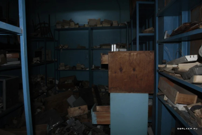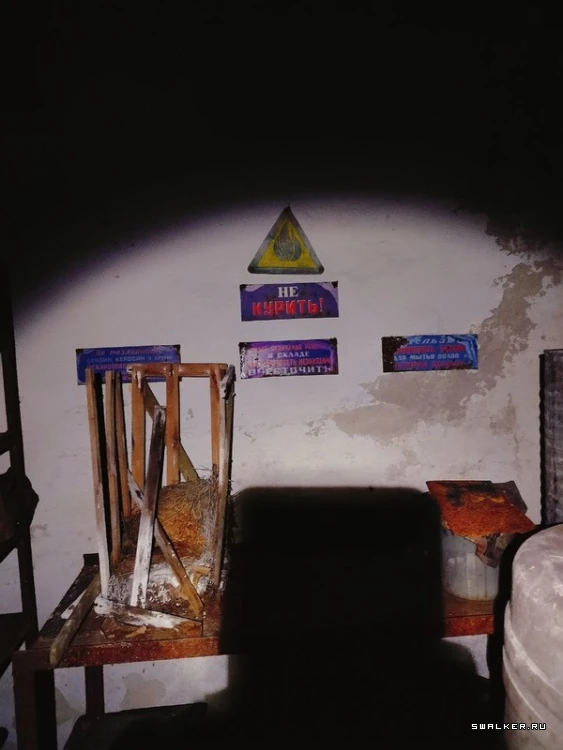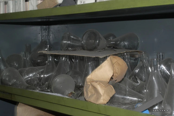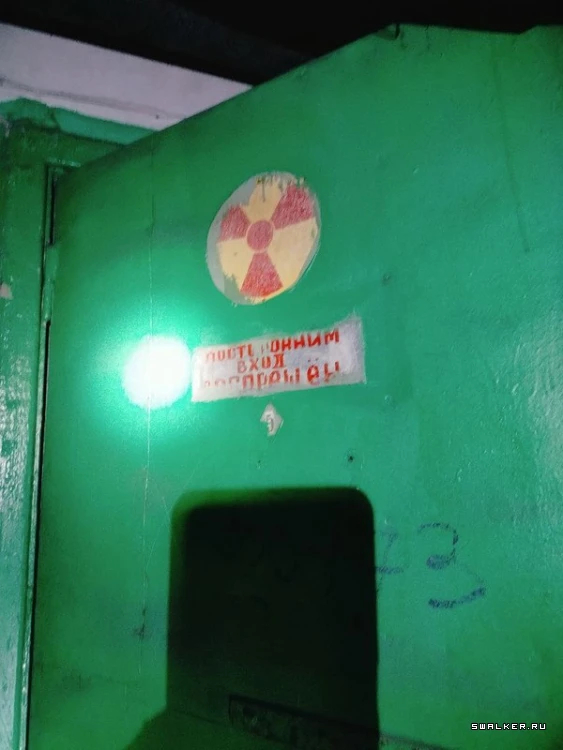 Войдя в здание, я оказался в большом тёмном коридоре первого этажа. Первое, что бросилось в глаза, — дверь с радиационным знаком, который всем своим видом показывал что в помещении опасно, и ходить туда не стоит. Однако насчёт этого у меня было другое мнение. Я без раздумий открыл её. Внутри стояли стеллажи с химическими реагентами.