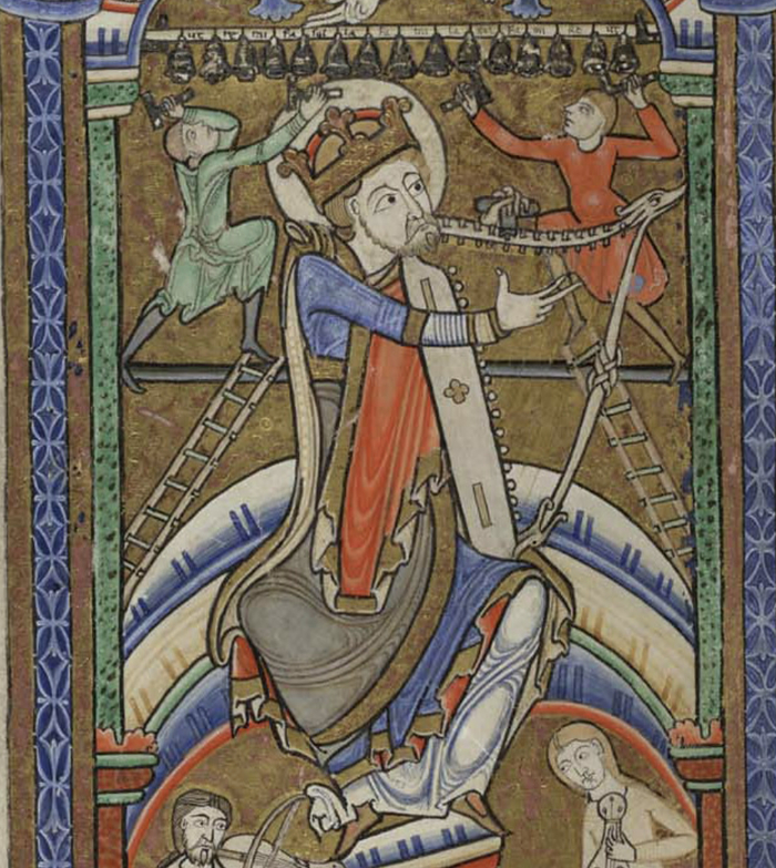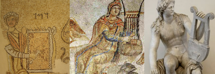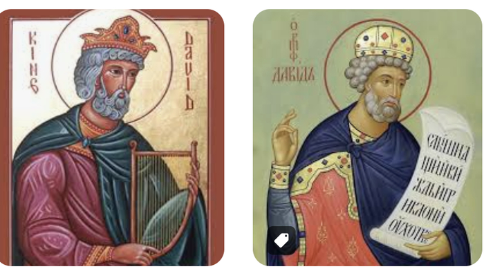 во втором псалтырь написанный Царем Давидом так и инструмент изображаемый в его руках(псалмы часто поются) . Давид псаломщик.