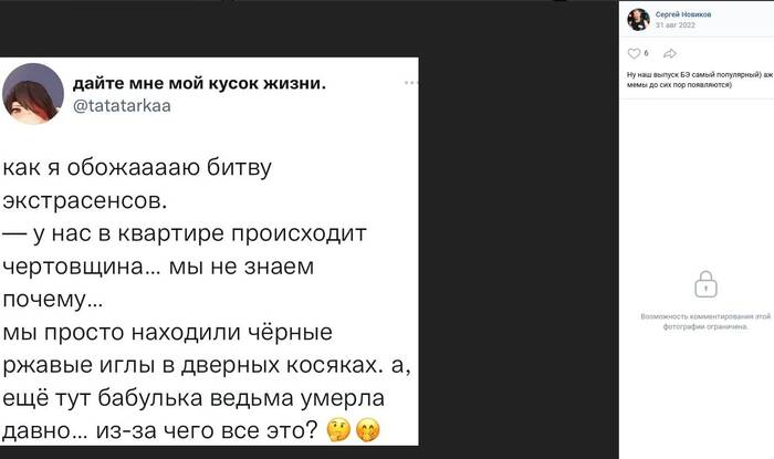 Также известно, что Новиков участвовал в одном из выпусков шоу «Битва экстрасенсов». В программе он жаловался на проклятие в квартире, которое было заложено со ржавыми черными иглами. Медиумы были уверены, что именно проклятие повлияло на то, что мужчина переболел раком и потерял супругу. Мать Сергея настаивала, что в квартире гуляют неупокоенные души.