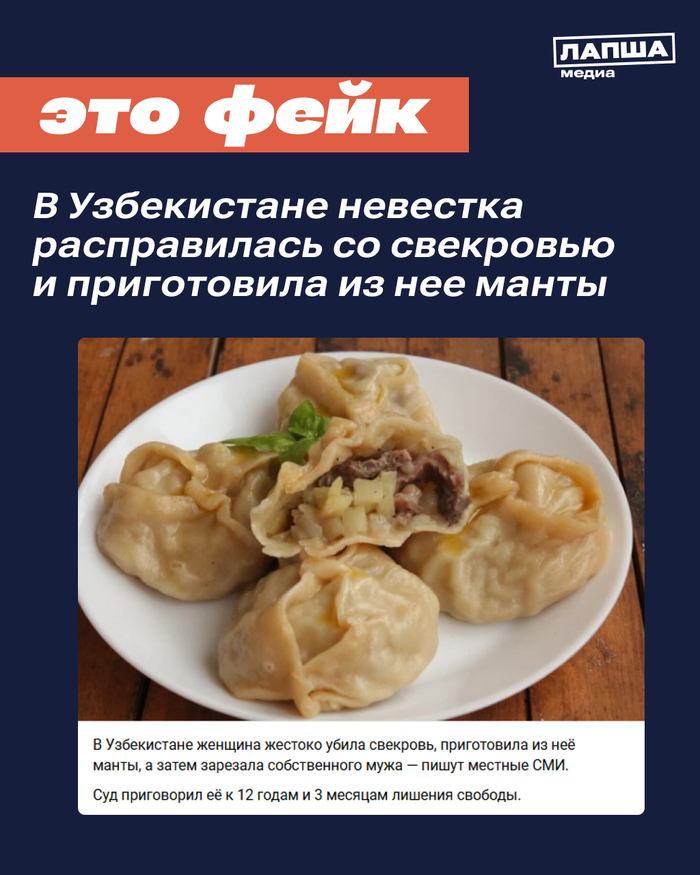 В соцсетях расходится шокирующая криминальная сводка из Узбекистана о женщине, которая якобы расправилась со свекровью, приготовила из нее манты и угостила ими соседей.