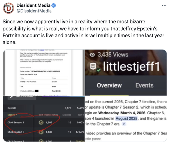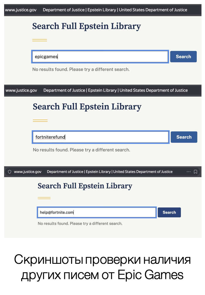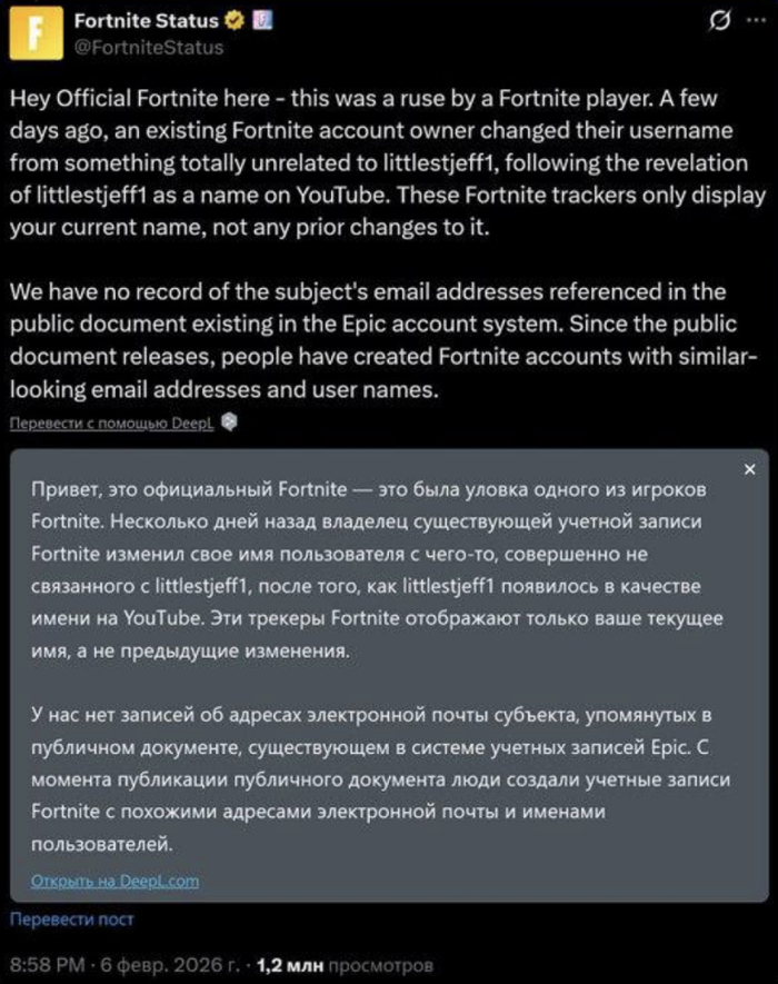 Никнейм littlestjeff1 действительно встречается в старых письмах Эпштейна от YouTube. Однако после публикации архивов Минюста его мог взять себе кто угодно, просто для привлечения внимания. В опубликованном почтовом массиве Эпштейна нет сервисных писем от разработчика игры Fortnite — Epic Games (подтверждение регистрации, приветствия, счета), что было бы неизбежно при реальном владении аккаунтом.