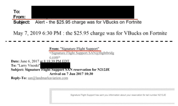 Сравнение: Письмо от Signature Flight с открытым отправителем vs Письмо про V-Bucks со скрытым отправителем.