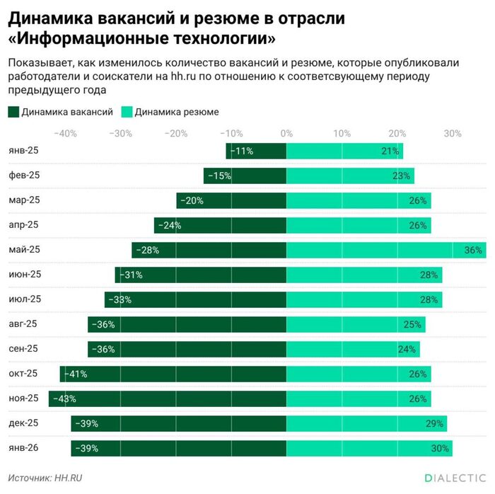 Российский рынок труда в сфере информационных технологий столкнулся с беспрецедентным уровнем конкуренции среди соискателей на фоне массового сокращения предложений от работодателей. Подсчитал «Диалектик» по данным платформы для поиска работы и подбора персонала HeadHunter.