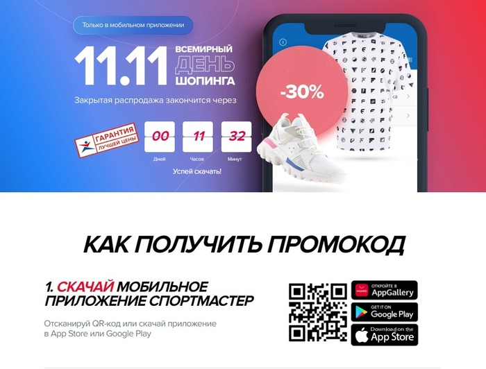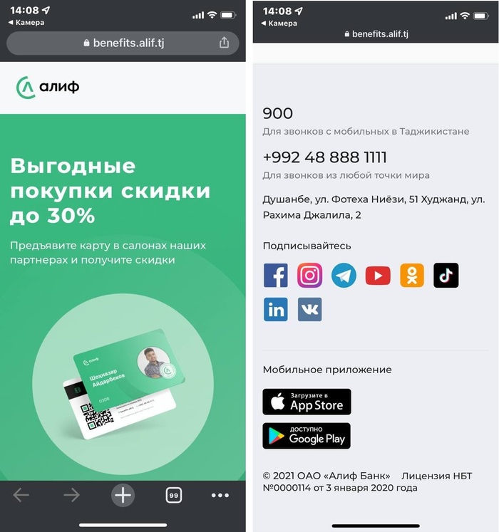 Сканирую qr-код и получаю ссылку...но не сразу понимаю куда она ведет...действительно скидка 30%. НО! Это промоакция какого таджикского банка "Алиф". Я думаю "Ну не может такой крупный магазин как "Спортмастер" так сесть в лужу. Беру другой телефон, сканирую код...такая же история. Пишу друзьям, они проверяют - всё так же.