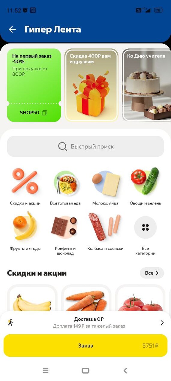 Среди предложенных магазинов сделал выбор в пользу Ленты, сформировал заказ- получилось около 6000 руб. Тут стоит отметить, что к выбору чего бы то ни было я подхожу достаточно тщательно, оцениваю с позиции дорого/дешево, нужно/не нужно, пытаюсь вспомнить - какие товары мог забыть, и т.д. Поэтому процесс сбора корзины у меня занял примерно час. Так вот, перехожу на страницу оплаты, ввожу промокод и получаю скидку 500 рублей! Чувствую неладное - не зря же я заканчивал физмат лицей и получал высшее экономическое, и точно знаю, что 50% от 6к лежит где-то в диапазоне от 2 до 4 к. но точно не 500 рублей. Удаляю промокод, ввожу заново - результат тот же. Тут уже начинаю чувствовать что-то неладное, но решаю проверить себя - вдруг я не увидел условия акции под звездочкой, пошарил по разным разделам приложения - но не нашел НИЧЕГО! никаких условий этой акции кроме тех, которые вы видите на первом скрине. Зато, эта акция продублирована еще в трех местах сайта