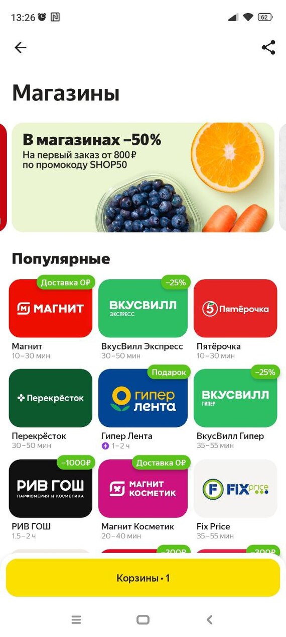 Выберите ресторан или магазин, оформите корзину на сумму от 800 рублей.