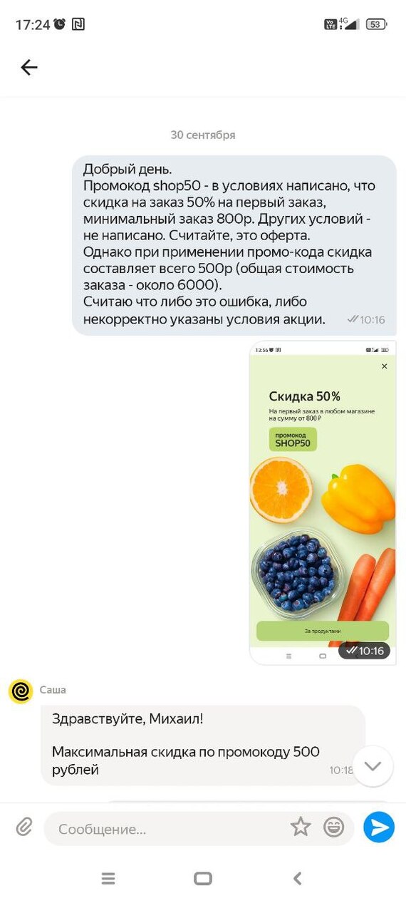Т.е. старший специалист поддержки косвенно подтверждает наличие второго промокода с помощью вопроса: Слыш, откуда промокод взял? Но следующим же сообщением включает тоже дурака и присылает мне информацию по первому промокоду на 10%.
