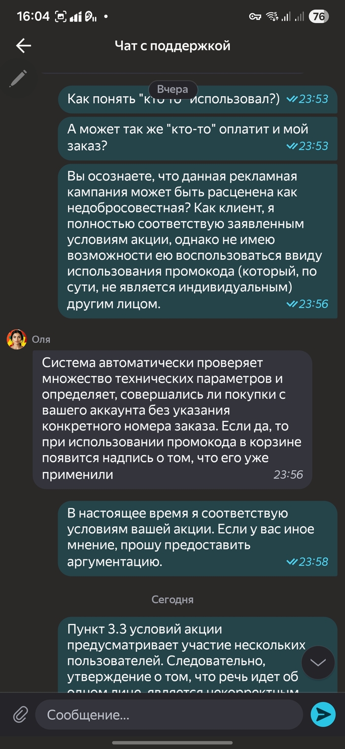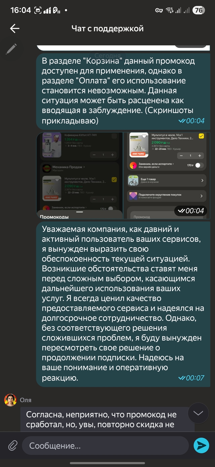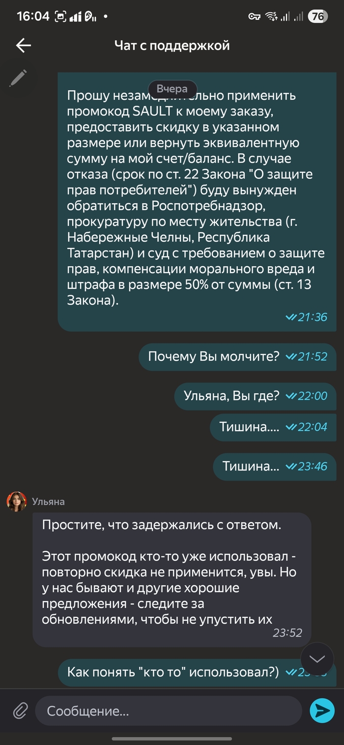 Пишу в поддержку, а мне отвечают: «Кто-то уже оформил заказ с этим кодом, вам использовать не удастся». И всё, до свидания. Скриншоты переписки прикладываю. Сейчас поддержка меня просто игнорирует.
