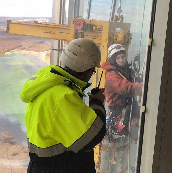 Монтаж всего одного рельса может занимать до 10 часов, то есть, целую смену. Да даже добраться до места работ бывает непросто. Выше 30-го уровня к точке монтажа альпинисты спускаются с самого верха башни. Для этого нужно подняться до 82 этажа на лифте. Потом пешком с 82-го до 87-го и обратно – вниз – на этот раз уже снаружи башни по тросам. До 20-го уровня это 30-40 минут летом и 1,5-2 часа зимой.