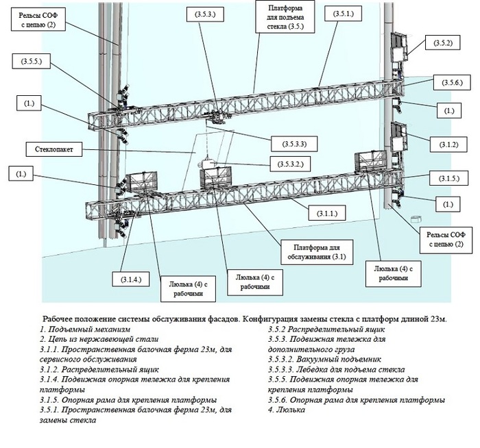 Примерно по такому же принципу будут обслуживать и фасады Многофункционального здания. СОФ МФЗ формируют два передвижных крана с вылетом стрелы 4.37 м, шесть кранов с вылетом стрелы более 10 м и два крана со стрелой в 12,5 м для фасадов атриума.