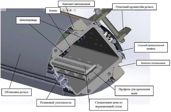 Сам рельс – это достаточно сложная конструкция, в которую интегрирован шинопровод для подачи энергии (примерно, как в метро), система освещения фасада и цепь из нержавеющей стали.