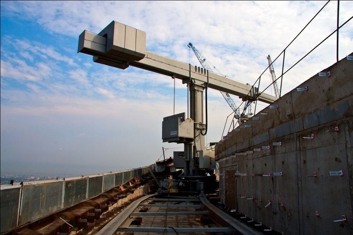 При решении этой уникальной задачи пришлось параллельно решать еще несколько сопряженных инженерных ребусов. И самый первый – как доставлять к меcту монтажа рельс, весящий около 1,3 тонны, когда краны, работавшие на строительстве башни, уже демонтированы? Выход нашелся в опыте железнодорожников, которые используют трассоукладчики, строящие перед собой пути, по которым двигаются дальше.