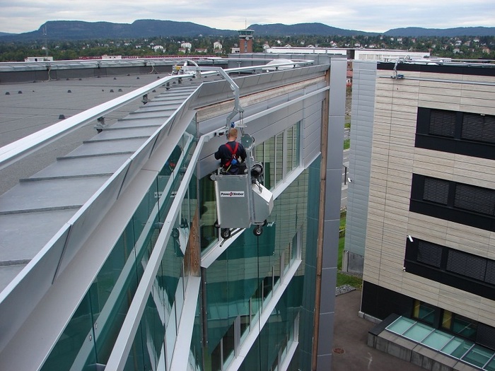 Существуют и более экзотические варианты, например — монорельсовые фасадные системы, которые перемещаются по профилю из алюминиевого сплава. По направляющим профилям движется небольшая платформа, 1-2 метра в длину, подвешенная на тросы. Но такие системы не устанавливают на здания выше 80 м.