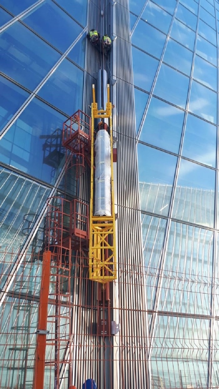 Дополнительной сложностью для проектировщиков СОФ стала геометрия здания, резко сужающегося на уровне 51-го этажа. Для работы сразу с двумя вертикальными плоскостями подъемник оснащен телескопической стрелой с вылетом 19 м и специальной системой крепления к фасаду soft rope system. Грузоподъемность люльки 240 кг, скорость подъема — 8 м/мин.