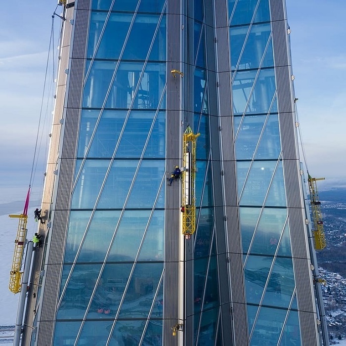 Но, как бы то ни было, принцип у всех этих систем один – кран и люлька. И подходят они только для прямых фасадов. Не для таких, как у башни Лахта Центра.