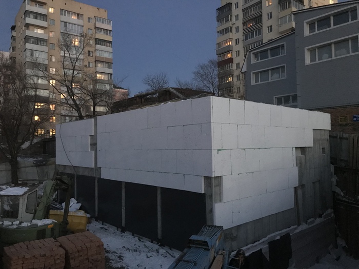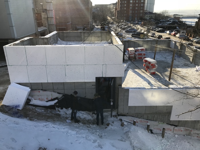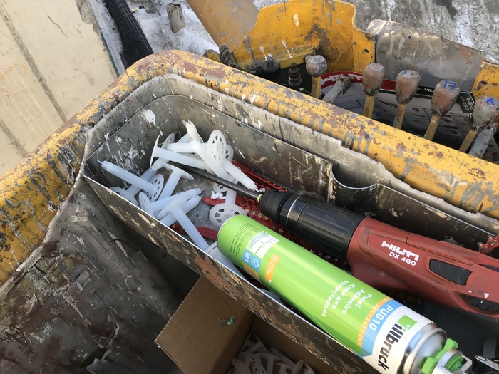 Работы на фасаде идут круглые сутки. Кому-то нравится работать ночью, правда весь монтаж – при свете фонариков. Кто-то предпочитает день, когда пусть и шумно, но и видимость отличная. При силе ветра более 10 м/с работа останавливается. Зимой — с учетом температуры и ветра. При минус -15 внизу, наверху, при сильном ветре, может быть -25. Без ветра разница температур верх/низ – 1.5-2 градуса. Работают альпинисты на башне до -20.