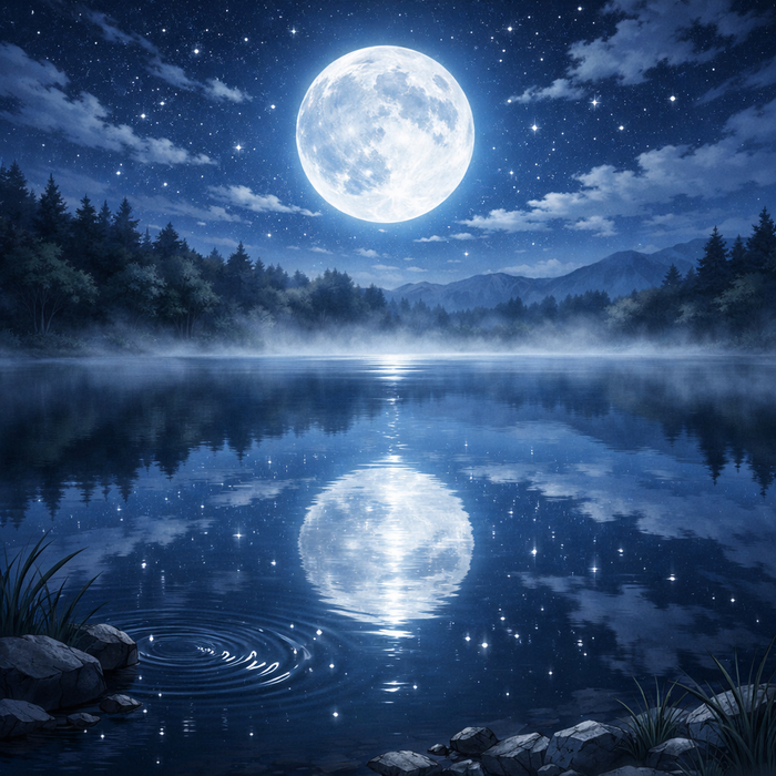 Промт: Anime-style lake under a full moon: silver moonlight pours across the night sky, bathing the landscape in a cool, gentle glow. The water lies perfectly still, reflecting the bright moon and scattered stars like polished glass. A thin veil of mist drifts slowly above the surface, softening the shoreline and distant trees. Subtle ripples form near the edge, and the quiet air feels calm, mystical, and filled with serene nocturnal magic.
