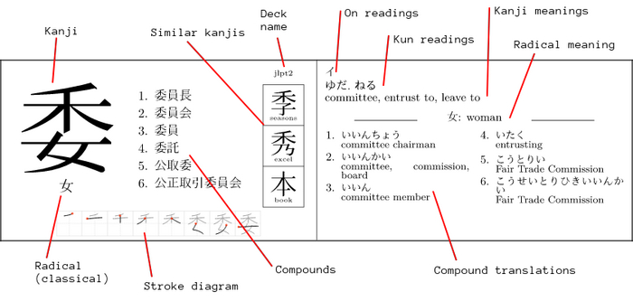 На одной половине карточек они писали Кандзи и порядок черт. На другой - его значение, чтение, и слова. Типа такого выходило, но на русском и попроще: