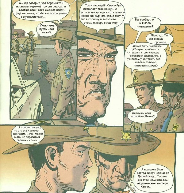В это время приезжает шериф Рут со своими помощниками. Они хотят вести расследование, при том Рут уверен, что здесь не обошлось без вмешательства марсианских ниггеров, но карты портит ФБР, которое отправляет своего агента.