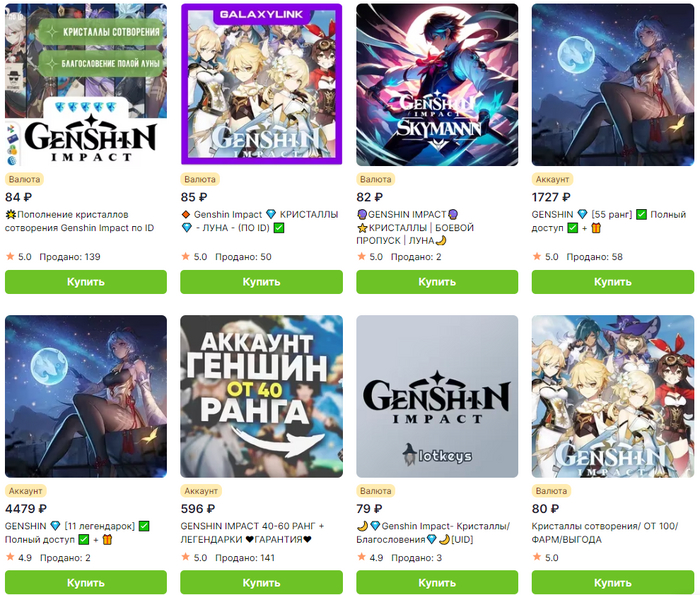 В зависимости от того, что приобретаем (БП, Луна или кристаллы), выбираем нужное среди множества предложений, отталкиваясь не только от цены, но и от таких критериев, как количество продаж, рейтинг и отзывы продавца.