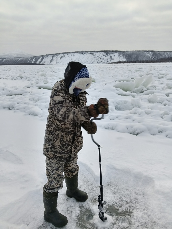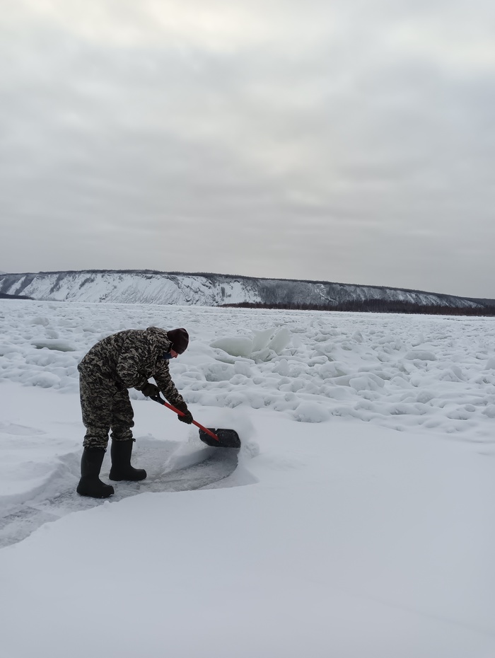 Какая удача! Вода ещё есть на ровном месте (обычно на переходе протоки в Колыму, лёд опускается на уровень Колымы, по ландшафту дна наша протока выше, когда это произойдет,то нужно будет дальше от берега делать прорубь),не нужно лезть в ломанный лёд.