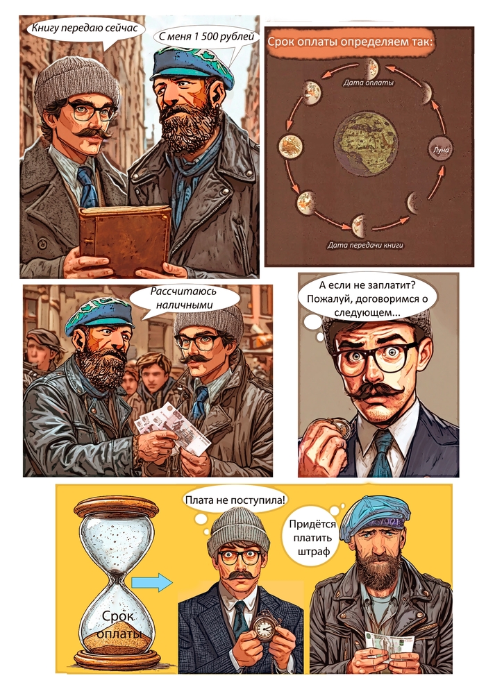 🤝Покупатель, восприняв это как шутливый маркетинговый ход, согласился. Стороны вместе создали шедевр договорного права в картинках. На панелях комикса красовались подписи: «Передаю сейчас», «С меня 1500 руб.», а срок оплаты был определен как «половина оборота Луны вокруг Земли». На случай просрочки была предусмотрена санкция: «Придется платить штраф» в размере 1000 рублей.
