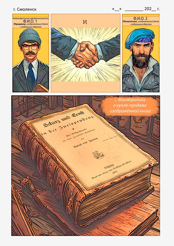 📌Всё началось в ноябре 2024 года. Житель Смоленска приобрел у индивидуального предпринимателя редкий антикварный фолиант — книгу Рудольфа фон Иеринга «Scherz und Ernst in der Jurisprudenz» 1884 года выпуска. Стоимость лота составила 1500 рублей. В честь Международного дня акварели продавец предложил покупателю оригинальную акцию: отсрочка платежа в обмен на оформление договора купли-продажи в виде комикса.