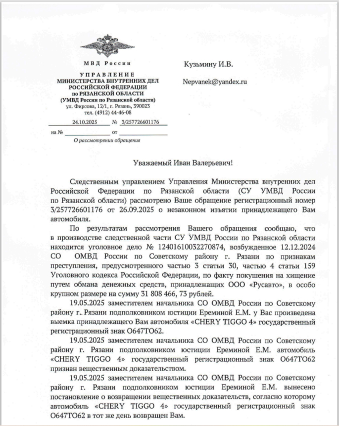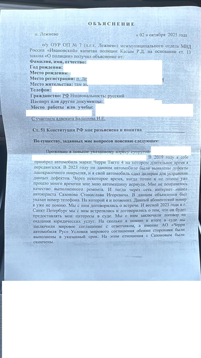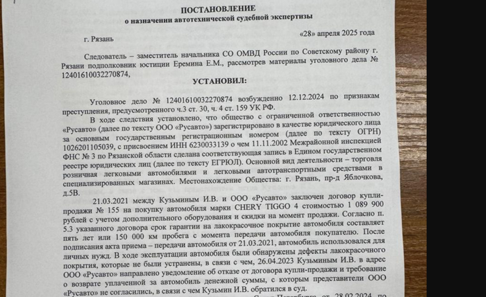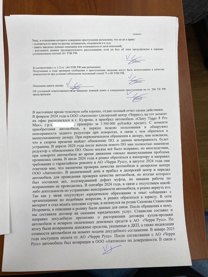 Единственное, что они реально сделали на сегодня так это попробовали запугать мои клиентов, чтобы ко мне никто больше никто не обращался. Оцените рязанское ноу-хау. Они взяли данные по десяткам моих клиентов (данные вероятнее всего им "слили" в Чери, потому что это были клиенты которые вернули машины именно в само "Чери Автомобили Рус") и написали в УМВД по Рязанской области заявления, что эти люди купили у них в Рязани машины (в их салоне ООО "Русавто") и совершили мошенничество.