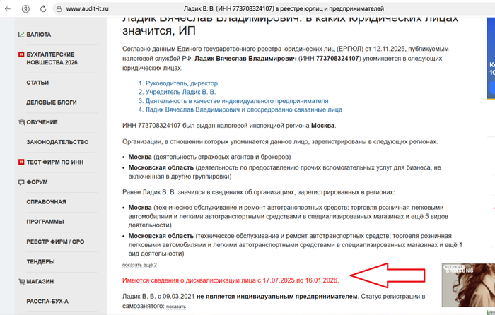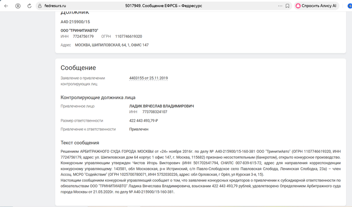 Более того, Вячеслав Ладик находится в реестр дисквалифицированных лиц, то есть официально не может занимать руководящие должности в организациях. Как тогда он числится управляющим?
