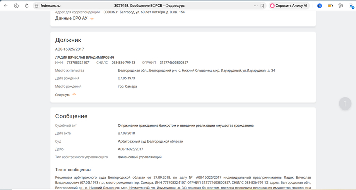 2. Однако до карьеры в Москве , он банкротился как индивидуальный предприниматель, для чего временно переехал в Белгородскую область. Манипуляция с подсудностью что ли, Вячеслав Владимирович?
