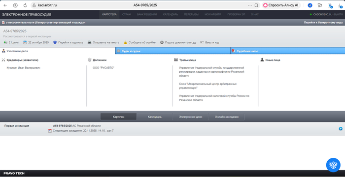 Напоминаю, в том году банкротство не удалось провести только потому ,что Октябрьский районный суд Рязани незаконно выписывал ООО "Русавто" отсрочки исполнения судебного акта. В таком случае Арбитражный суд по закону не может признать должника банкротом.