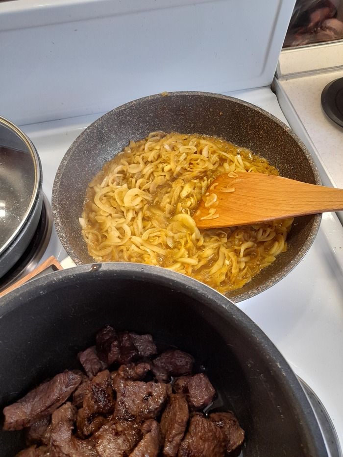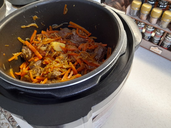 Доготавливаться мясо будет в скороварке. В том же масле, обжарил лук,