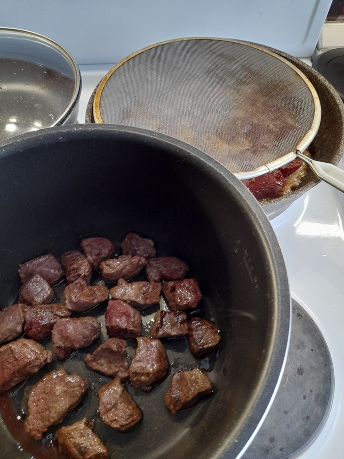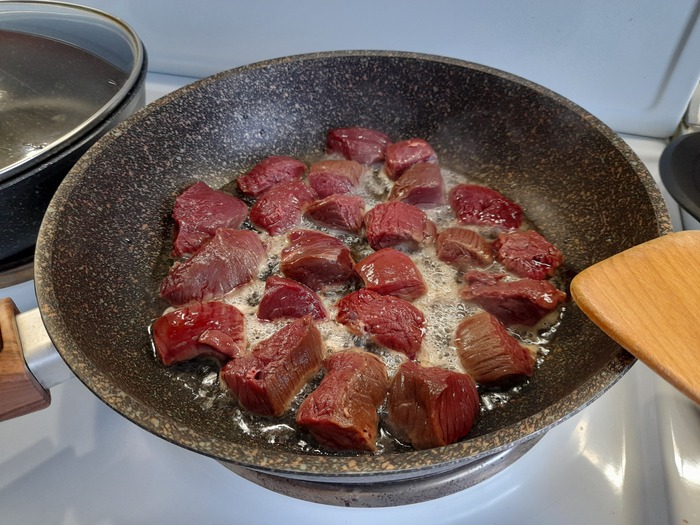 Порезал на кусочки, 2х2 см, обжарил быстро на раскаленной сковородке, партиями. На всё мясо при обжарке ушло пол чайной ложки сахара и чайная ложка соли.