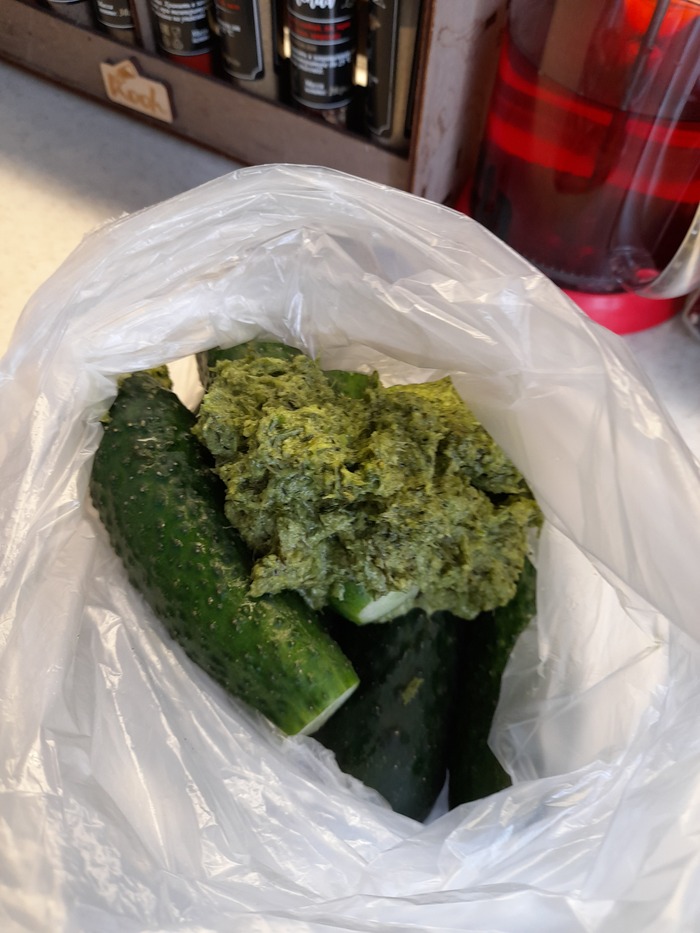 две чайных ложки соли, пучок укропа и 5 долек чеснока взбил в кашу и заправил полкило огурчиков, хорошо их перетряхнул и оставил на час. (Огурчики нужно через час обязательно сполоснуть, иначе их кушть не возможно из-за пересола и насыщен