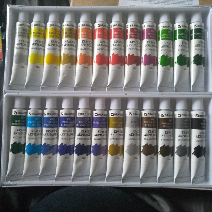 И вот я заказала красок и решила подобрать цвета и нарисовать картину. Но поиски засохших красок не увенчались успехом. Перерыв интернет я нашла несколько фото, с баночками красок, но там плохо видна разница между схожими оттенками.