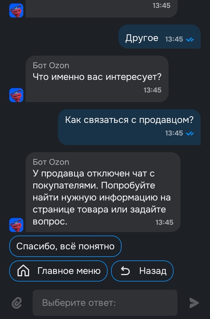 А я ж человек грамотный, поначитался тут, вершков всяких понахватался, пишу в ТП, мол, "требую доставить товар в кратчайшие сроки и компенсировать мне просрочку доставки по 0,5% от стоимости товара за каждый день просрочки. Баста!". А они мне говорят: "А мы, так-то, не продавец, иди к нему и решай, че так долго, а мы и не доставщики иди к ним и решай, че так долго. И компенсировать тебе нихера не будем, так как сроки в заказе указаны примерные. И мы, вообще, только площадка. Потому что иди нахуй вот почему!" И я бы и продавцу сам написал, только вот чат с продавцом они отключили, потому что так лучше для всех)))