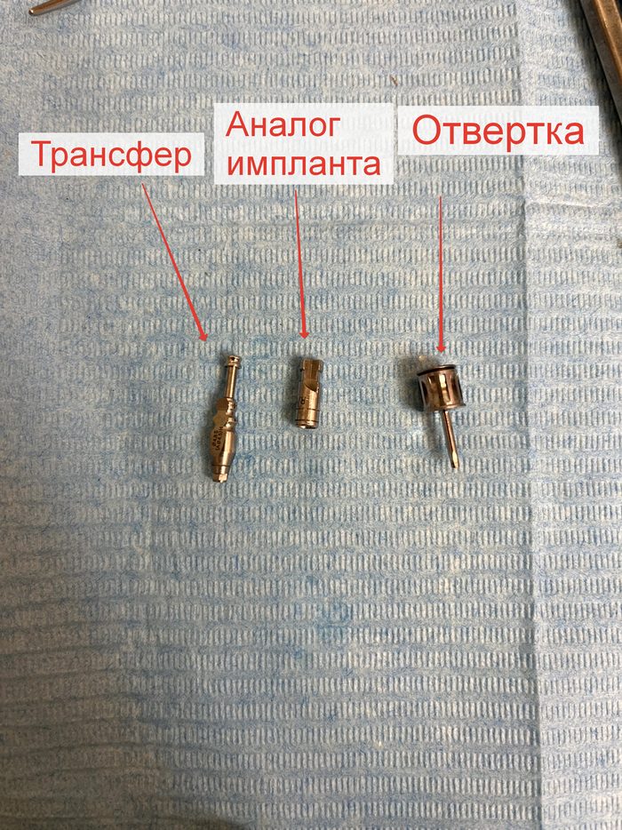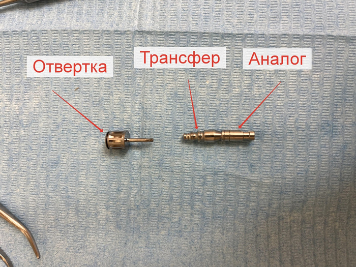 Далее доктор прикручивает к импланту трансфер- специальная запчасть, которая позволит передать зубному технику максимально точное положение импланта.