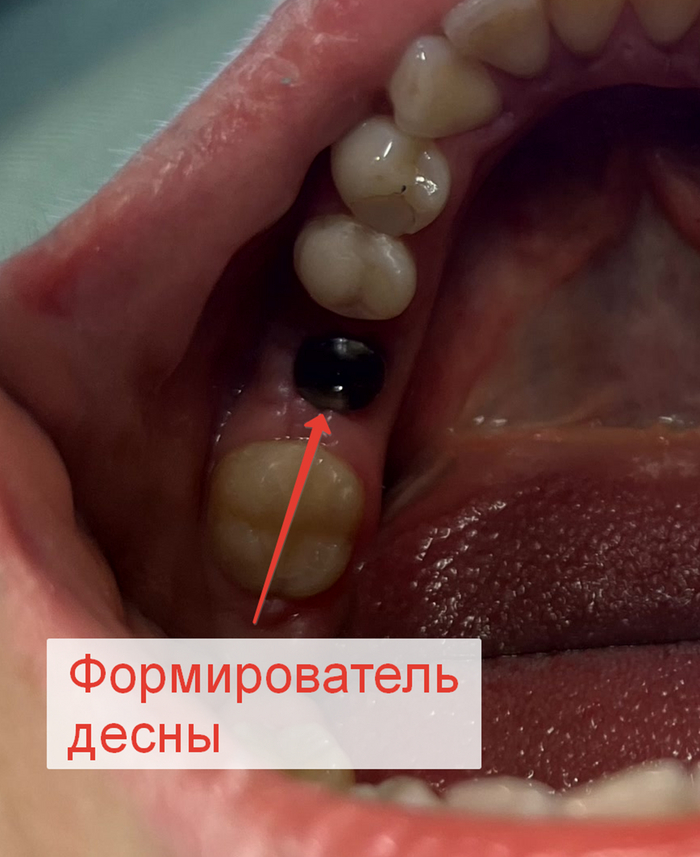 Напомню кратко, что после установки импланта ставят либо заглушку, либо формирователь десны (такая цилиндрическая хрень, которая создает контур будущей коронки) и отправляют гулять на 3-6 месяцев, пока этот имплант не срастется с костью.