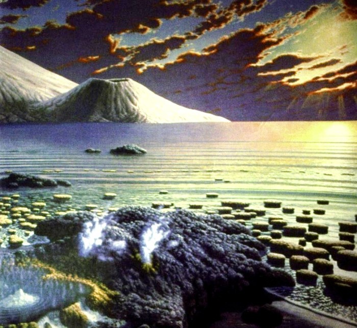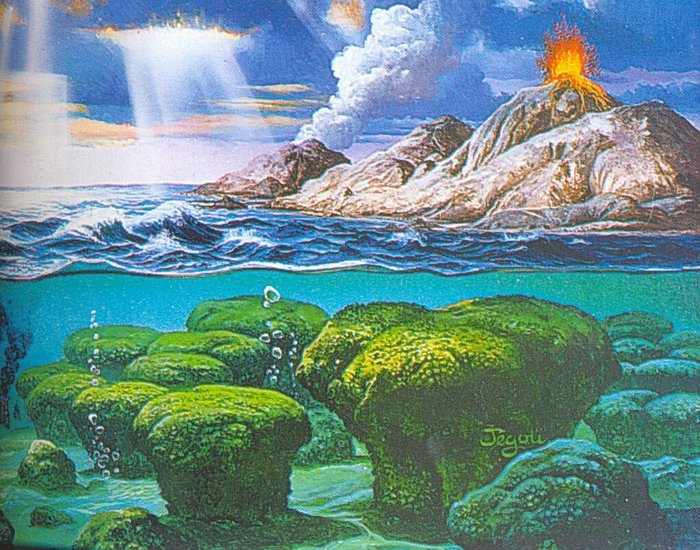 Первые "вразумительные" эукариоты, то есть настоящие клеточные организмы, конечно, водоросли были скорее всего, зеленые водоросли появились только около полутора миллиардов лет назад, а такие менее очевидные около 1 млрд - 800 млн лет назад, но до сих пор непонятно, настоящие ли это эукариоты или же нет.