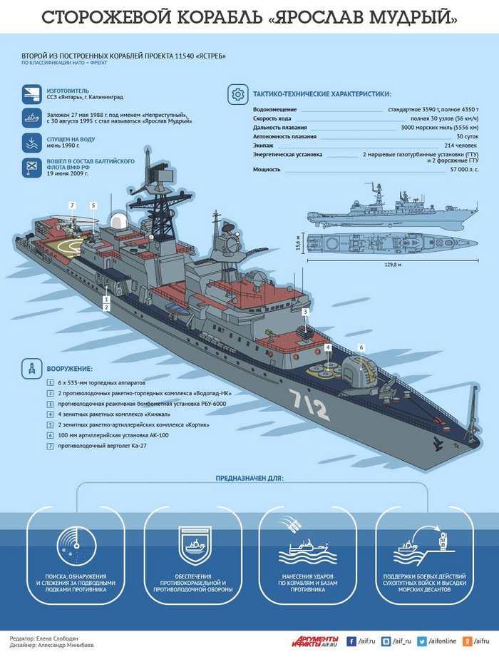 На вооружении: артиллерийская установка АК-100, ракеты "Кинжал", "Кортик", торпеды 533 миллиметра, вертолет Ка-27.