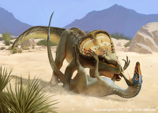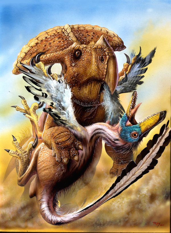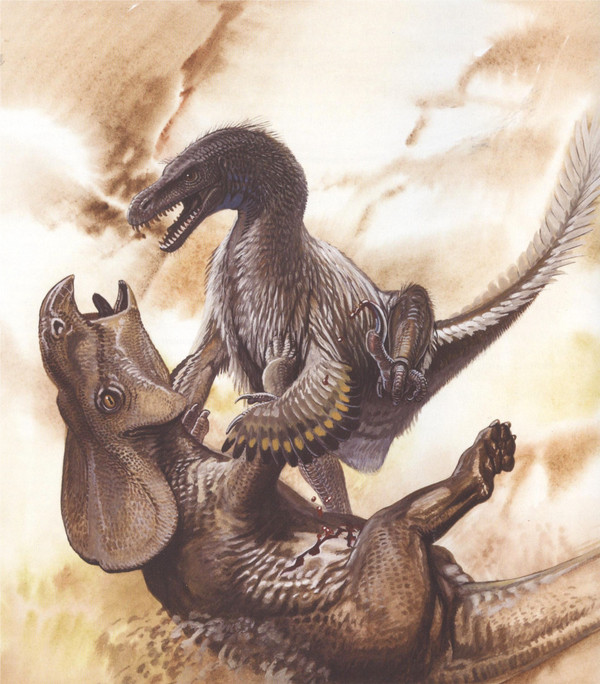 Растительноядный процератопс атакован хищным велоцираптором. Обычный объект охоты для этого хищника. В Монголии были найдены кости процеторатопсов со следами укусов и даже с застрявшими в них зубами велоцирапторов.