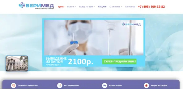 Все процедуры проходят на дому, что сохраняет конфиденциальность и позволяет пациенту оставаться в привычной обстановке. Стоимость выезда врача составляет от 1 500 рублей, дополнительные услуги психолога и кодирования оплачиваются отдельно. По соотношению услуг и цены Веримед занимает достойное место в рейтинге наркологических клиник в Москве, предлагающих амбулаторное лечение. Клиника работает ежедневно, выезжает в любой район столицы.