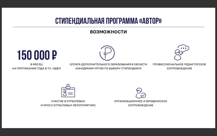 Чтоб начинающим сценаристам было чем питаться в это непростое время, ФК назначает им (и стало быть, мне) стипендию в размере 150 000 рублей за вычетом НДФЛ. Кроме того, оплачивает год обучения в любой отечественной киношколе по драматургическому профилю. Кроме того, после написания все права на сценарий остаются за автором, а ФК к тому же осуществляет всестороннее сопровождение сделки по продаже этого сценария киностудии. Единственное и главное условие – киностудия должна быть Российской (с Оскаром придется повременить). То есть, талантливый человек, написавший хороший сценарий, через год получит еще и денег за рыночную стоимость своей истории.