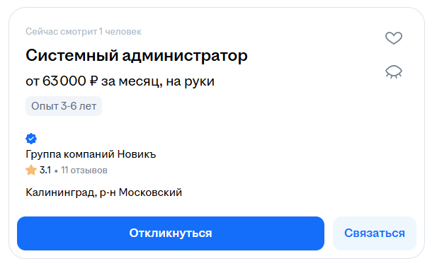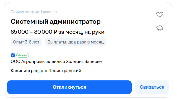 Резюме (что имеем): системный администратор, 12 лет стажа на этой должности, сертификаты CISCO, GOOGLE, HUAWEI, всяческие курсы повышения квалификации, навыки разработки программного обеспечения на разных языках на уровне "я далеко не начинающий, но и не средняк" (PHP, C, C++, Object Pascal), а также многолетние навыки обслуживания кассовых систем, софта сопутствующего, администрирования систем 1С и даже доработка 1С на любительском уровне (обработки, отчеты простенькие, формы), навыки построения СКС с нуля от архитектуры до физической сборки и протяжки, серверы, ЦОДы и т.п. В общем нормальный такой матерый админ классического типа, не из серии эникейщика про уровня, МФУ не чинил, картриджи не бегал не менял.