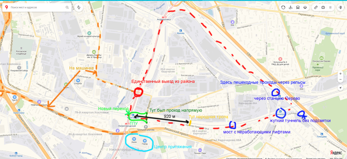 Тут плохо видно, написано: "Открылся подземный тоннель платформа Карачарово. Обход 920 м до платформы Карачарово". 920 метров, брат! Только до платформы. А еще надо обратно. То есть жителям Карачарово, а это тысячи людей, на голубом глазу предлагается пилить ДВА километра, чтобы перейти рельсы. С сумками из "Ашана" и "Леруа" на обратном пути). Ага, щаз! Естественно, жители Карачарово обеспечивают себе свой путь: