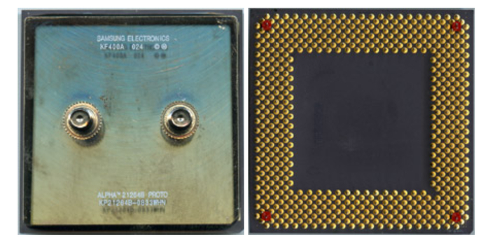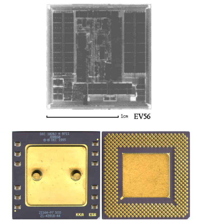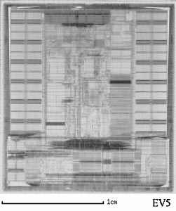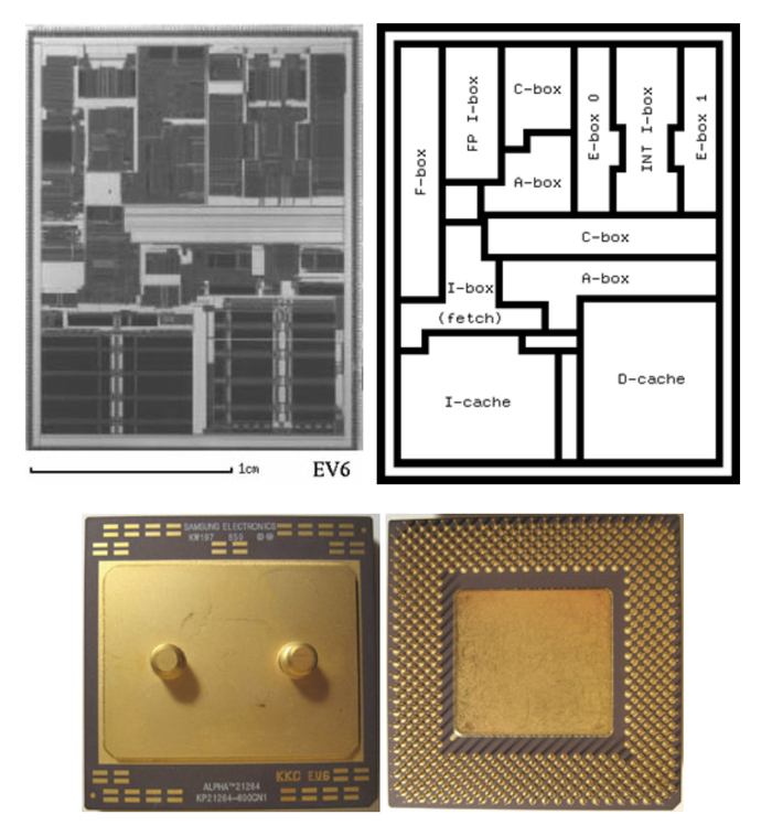 Хотя процессор 21264 (EV6) был разработан в DEC, и первая информация о нем была опубликована в октябре 1996 на Microprocessor Forum, окончательное воплощение в кремнии датируется февралём 1998, когда DEC уже была в процессе ликвидации. Собственно процессор представлял собой довольно существенный шаг вперед по сравнению с EV5, во многих аспектах революционный. Одним из основных нововведений было внеочередное исполнение (out-of-order execution) инструкций, повлёкшее за собой фундаментальную реорганизацию ядра, и снизившую зависимость основных функциональных устройств от пропускной способности кэшей и оперативной памяти. EV6 мог переупорядочить на лету до 80 инструкций, а это значительно больше, чем у других конкурентных разработок (к слову, архитектура Intel P6 предусматривала внеочередную обработку до 40 [микрокоманд], HP PA-8x00 -- до 56, MIPS R12000 -- до 48, IBM Power3 -- до 32, а PowerPC G4 -- до 5; разработанный к тому времени Sun UltraSPARC II переупорядочивание команд не поддерживал). Внеочередное исполнение дополнялось техникой переименования регистров (register renaming), и для этого в ядро было встроено дополнительно 48 целочисленных и 40 вещественных физических регистров (количество логических, то есть программных, осталось неизменным).