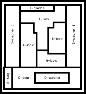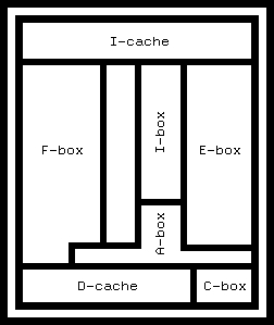 Количество целочисленных конвейеров было увеличено до 4 (организованных в 2 кластера), но функционально они были несколько неоднородны: 2-й конвейер мог выполнять операции умножения (7 тактов на инструкцию) и сдвига (1 такт), а 4-й -- MVI (3 такта) и сдвига; кроме того, все 4 конвейера поддерживали отработку элементарных арифметических и логических операций (1 такт). Каждый кластер располагал своим файлом целочисленных регистров (как упомянуто выше, на 80 записей), содержимое которых было идентично (синхронизировалось). 1-й и 3-й конвейеры также выполняли некоторые функции A-box, рассчитывая виртуальные адреса для операций загрузки/сохранения. Собственно A-box работал с I-TLB и D-TLB (каждый на 128 записей), очередями загрузки и сохранения (каждая по 32 команды), и 8 64-байтными буферами (miss address file) для операций с B-cache и основной памятью. Вещественные конвейеры также были функционально различны: 1-й поддерживал операции сложения (4 такта), деления (12 тактов для одинарной точности и 15 тактов для двойной), вычисления квадратного корня (15 и 30 тактов), а 2-й -- только умножения (4 такта). Между прочим, блок вычисления квадратного корня и соответствующие инструкции были нововведениями для архитектуры Alpha. Декодер, как и прежде в EV5, подавал до 4 инструкций за такт, а планировщик распределял их в 2 очереди: на целочисленные конвейеры (I-queue, 20 команд), и на вещественные конвейеры (F-queue, 15 команд). Кроме вычисления квадратного корня, были добавлены инструкции предварительной выборки, а также команды для переноса данных между целочисленными и вещественными регистрами.